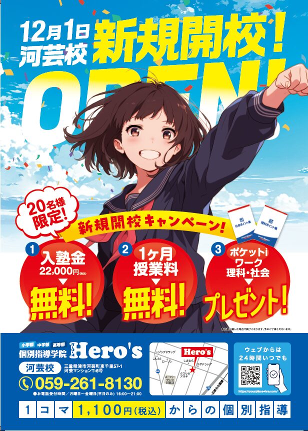 20名様限定特典!! 12月1日(月)開校! 2025年12月01日 本日12月1日(月)開校!!20名様限定特典あります! 12月1日(月)新規開校!! 20名様限定特典あります!! お問い合わせお待ちしております! お知らせ ヒーローズ河芸校開校まで【あと1日】 前へ 一覧へ 次へ おすすめ関連記事 先日、鈴鹿中学校・高校の説明会に参加してきました 2025年09月23日 **河芸校 2025年10月30日 12月1日開校です! 2025年11月19日 ヒーローズ河芸校開校まで【あと3日】 2025年11月27日